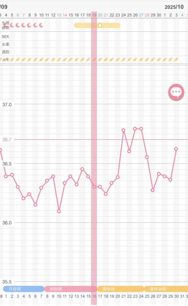 下記画像から予測排卵日がいつだったかを教えていただきたいのですが、先週は風邪を引いていたのもあり基礎体温が上がっていたのかなと思っております(9/22〜27辺りまで風邪を引いてました)。
