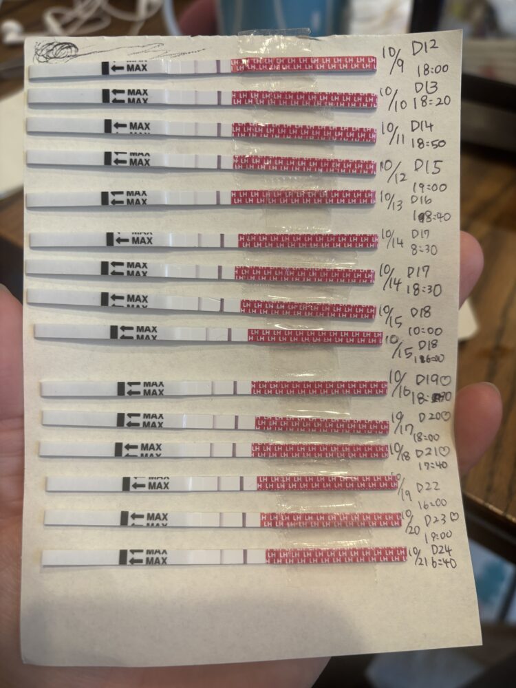 D12〜D24ですが排卵検査薬が陽性になりません。 D21が若干濃いかな?と思いますが前回より薄いのが気になります。