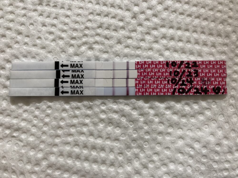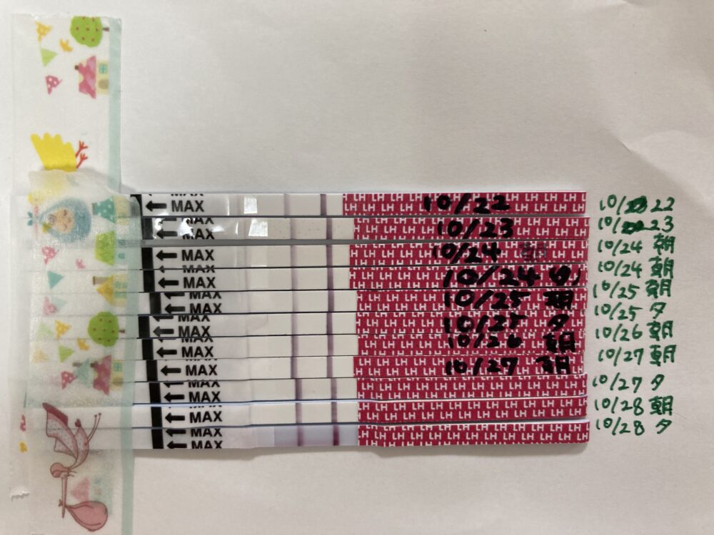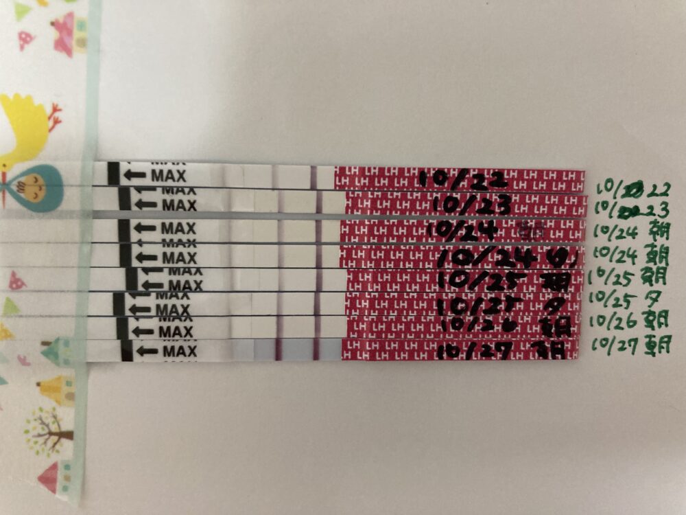 10/26の朝に(弱)陽性、10/27の朝には強陽性の反応ですね! くっきりとした陽性反応が確認でき、まずは一安心されましたでしょう♡ 排卵検査薬の結果から見ますと、明日10/28が排卵日となる可能性が高いです。