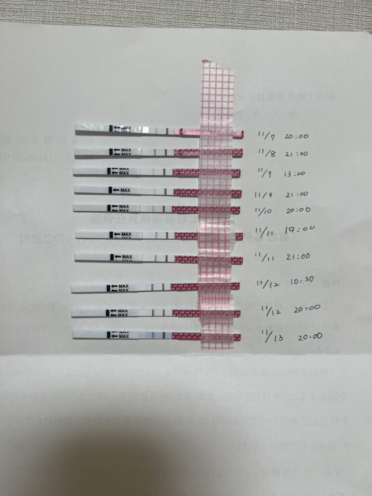 追加で検査しました。 11/12 10時半ごろに検査しましたら、写真は撮れてませんが、テスト線と同じ濃さになりました。
