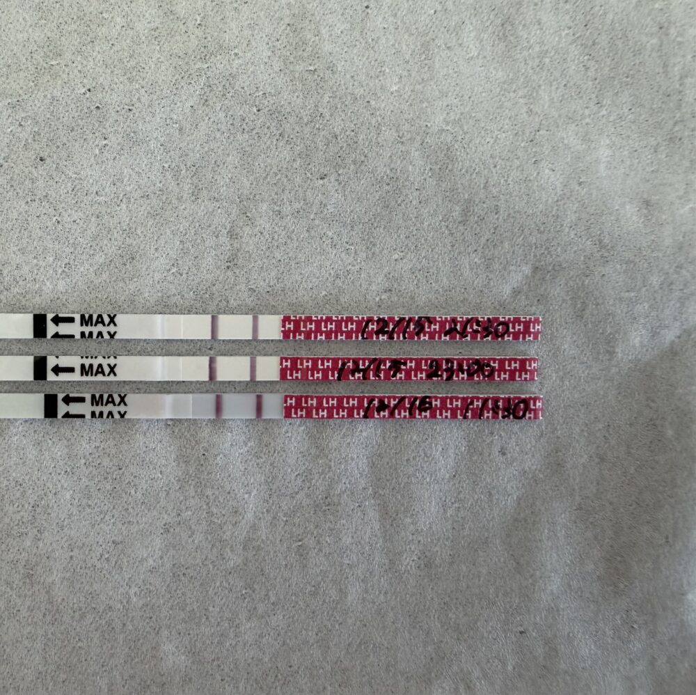 また、排卵検査結果の保管について、 1本ずつ個別に写真を撮影すると、反応時間や撮影条件、光の反射などの影響で、判定線の色が実物と異なって写ることがあります。そのため、検査薬の持ち手部分に日付を記入し、「検査済みのものをまとめて」1枚の写真に収めていただくと、色の濃さの変化が比較しやすく、より正確な判断がしやすくなります。