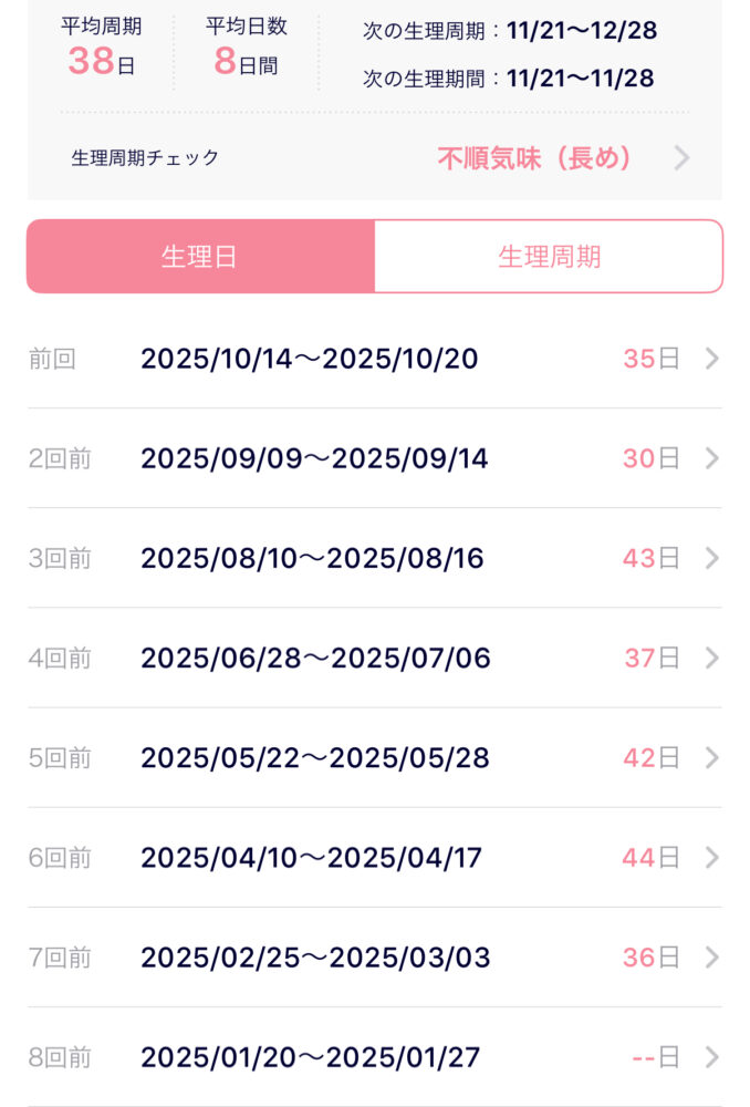 生理開始日:10/14 直近周期日数:35,30,43,37,42,44,36.