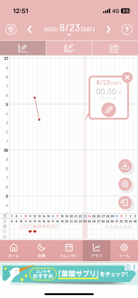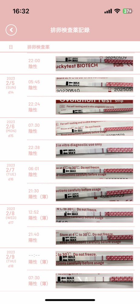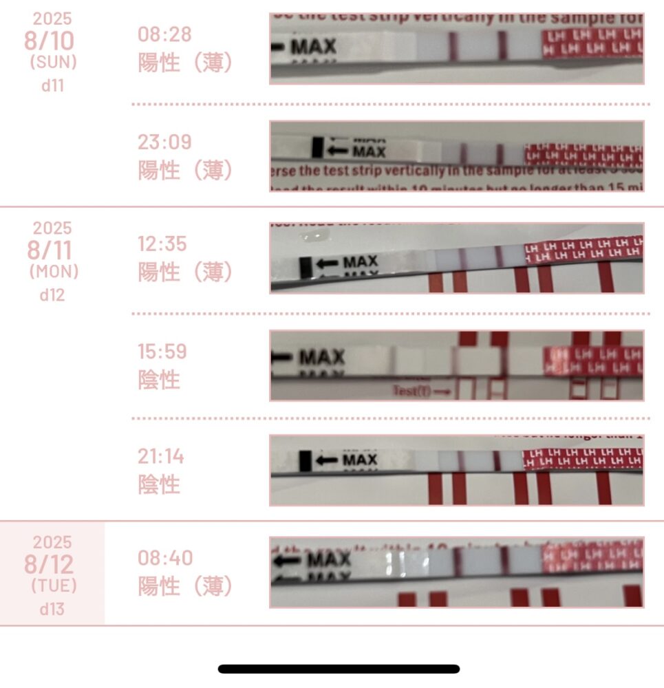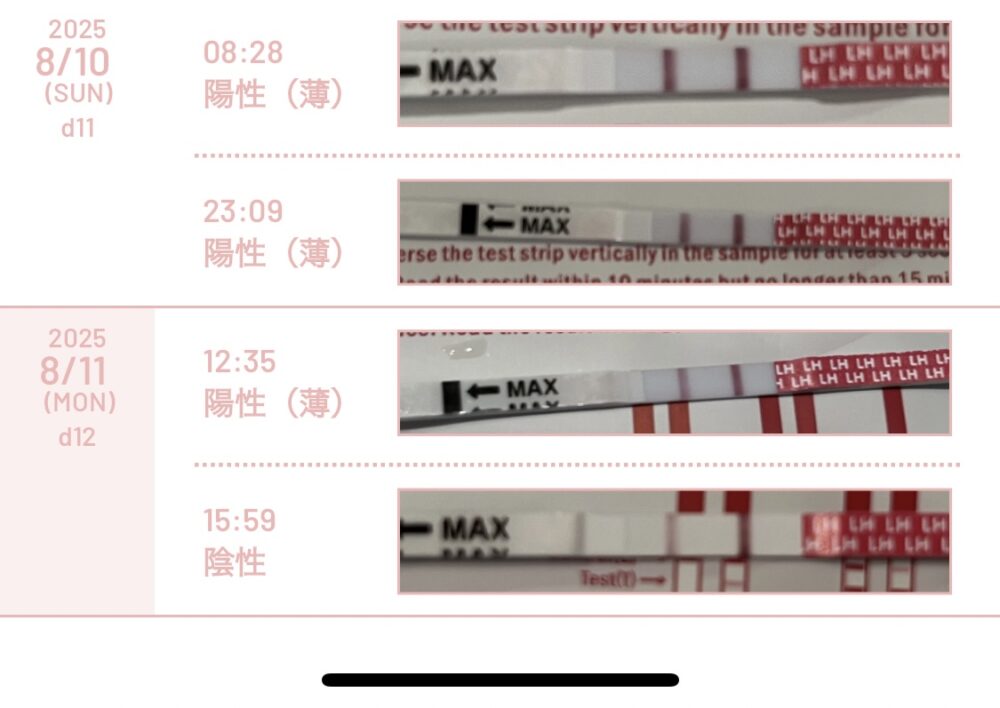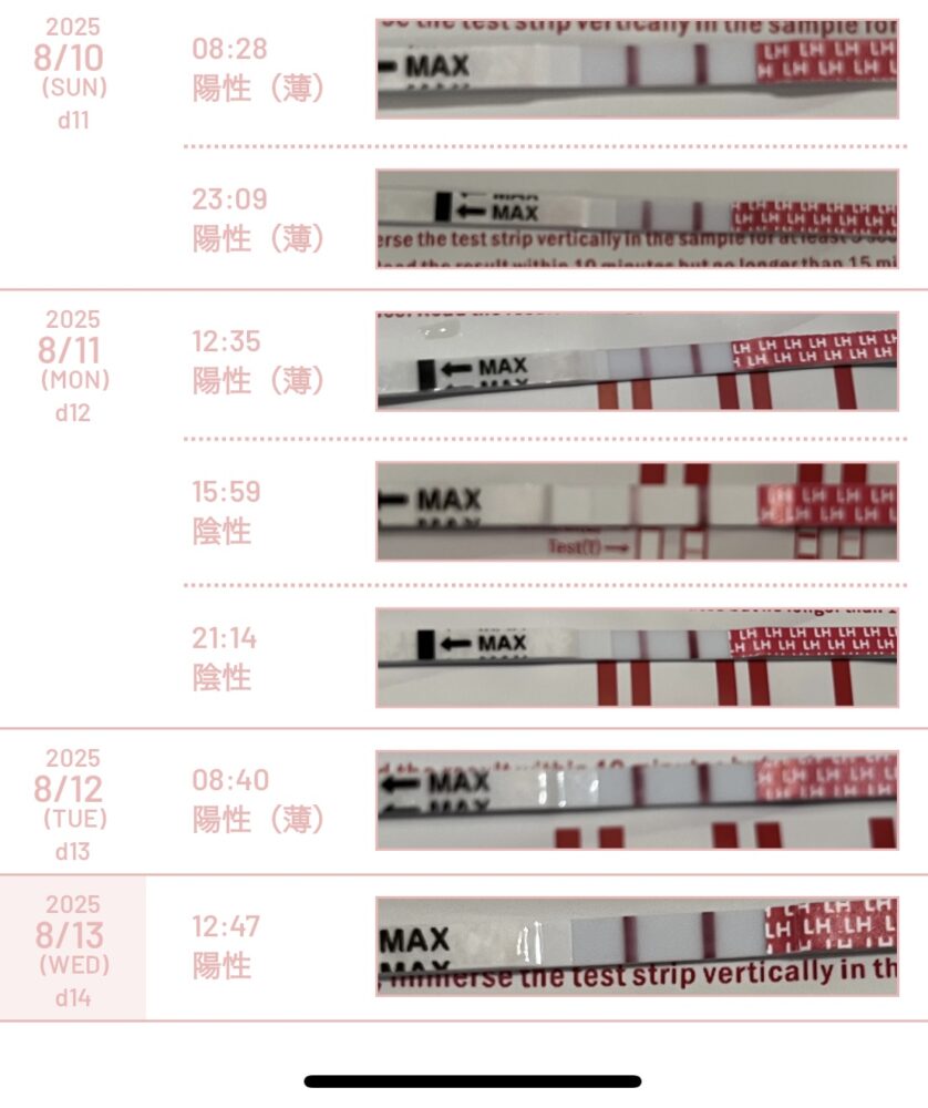 排卵検査薬の変化からはD12に排卵した可能性がありますが、生理周期日数から考えると、D12の排卵は少し早いように思われます。