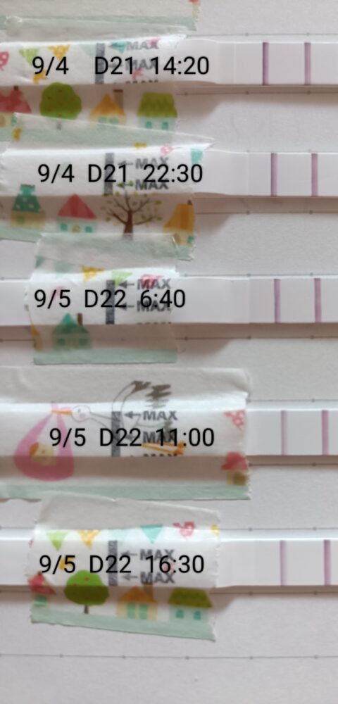 画像を確認しました。 9/4(D21)の14時から9/5(D22)の朝までは強陽性反応で、 9/5(D22)の昼からは薄くなりました。 検査薬の変化から見ると、9/5(D22)の午後から夜にかけて排卵した可能性が高いです。