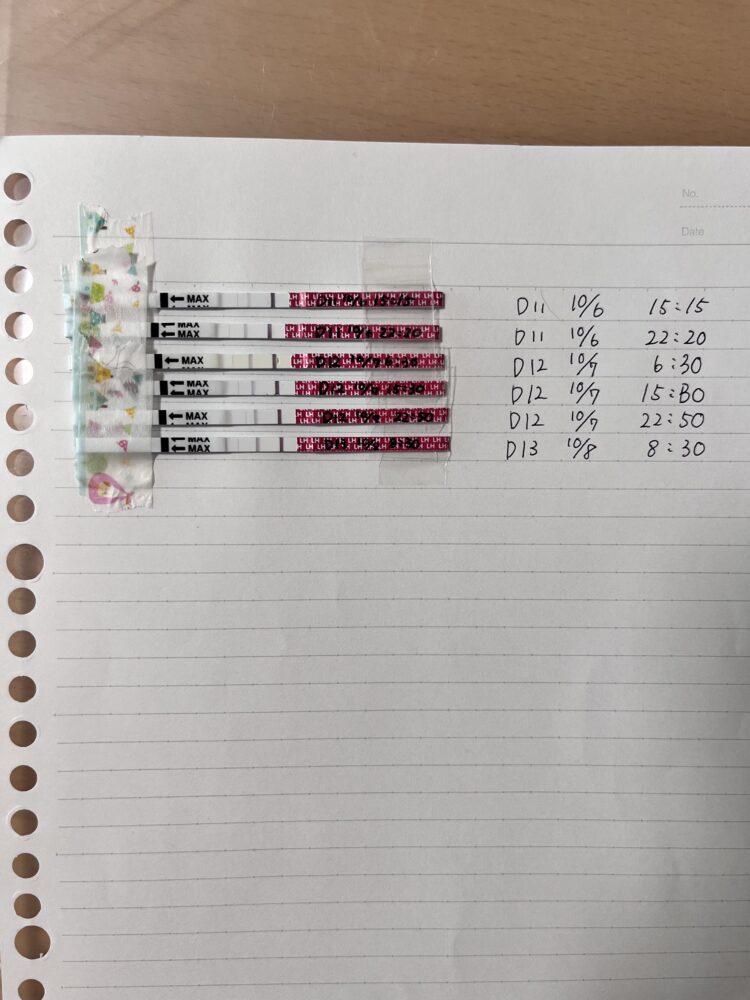 D11(10/6)から検査を始めているのですが、今日(D13の10/8)の朝の結果は弱陽性でしょうか? 弱陽性の場合、今晩のタイミングは避けたほうがいいですか? ちなみに、 ・最終生理は9/26〜10/1 ・直近の生理周期は29日 ・10/2.10/4.10/6でタイミングを取っていて、10/8.9とタイミングを取る予定 でした。 お忙しいと思いますが、ご返信お待ちしてます。 よろしくお願いいたします。