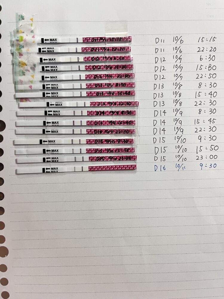 排卵検査薬の変化から見れば、10/10(D15)夜~10/11朝の間に排卵した可能性が高いです。