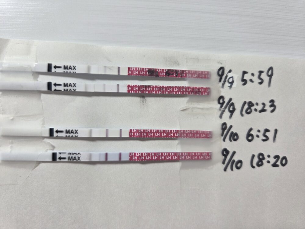 9/10(D14)朝は弱陽性反応、18時は強陽性反応です。 排卵検査薬から見て、9/11夜~9/12(D16)は排卵日になる可能性が高いです。